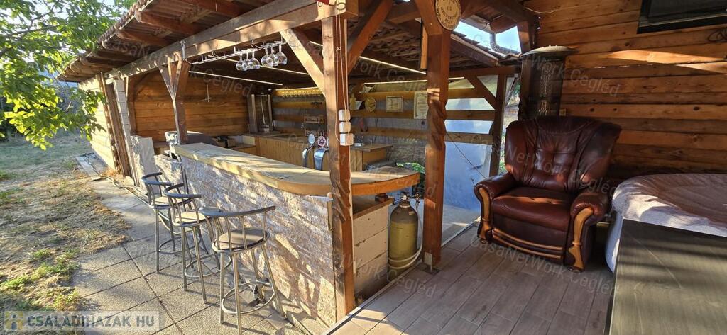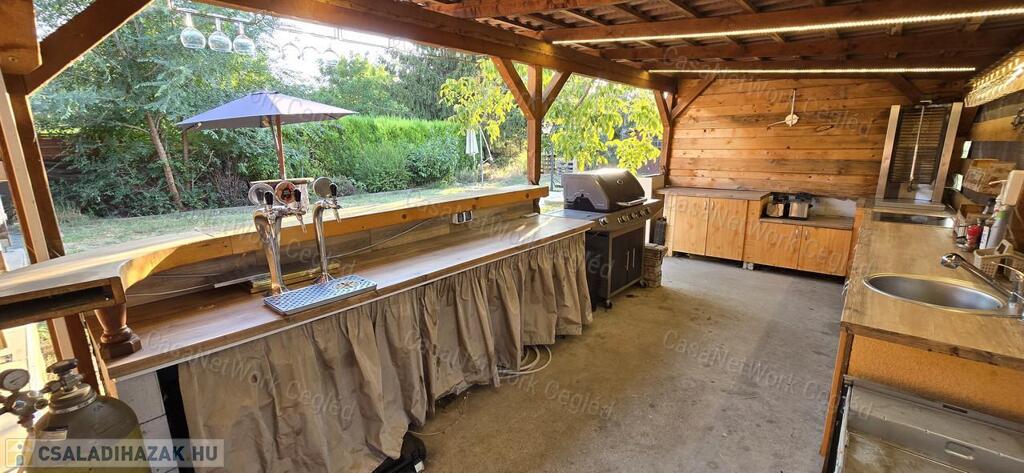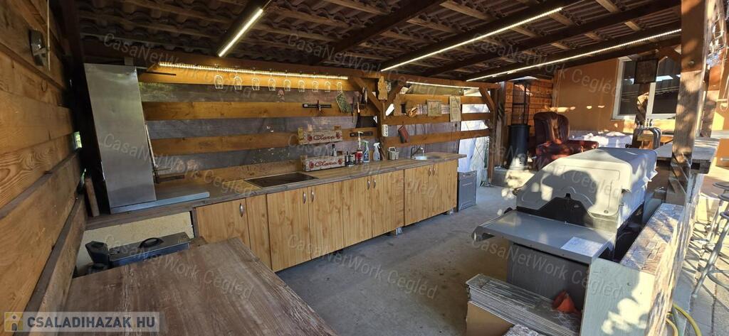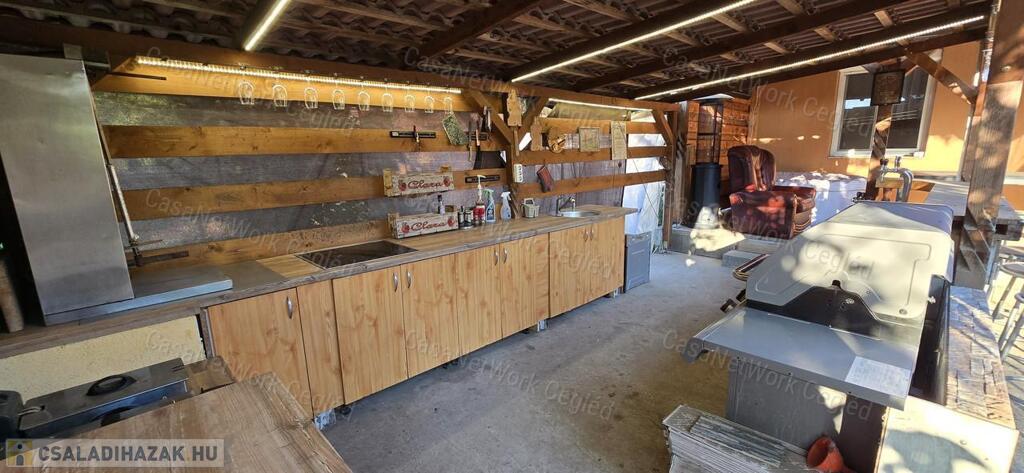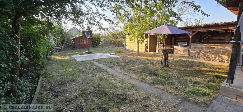 Az udvar különleges éke egy 18 négyzetméteres mini bár, amely teljesen felszerelt villanytűzhellyel, vezetékes vízzel és kézmosóval, gyros sütővel, háromkaros sörcsappal és beépített szekrénnyel. Emellett az udvaron különálló kinti WC is helyet kapott, valamint két autó számára fedett beálló és egy szintén 18 négyzetméteres tároló biztosítja a kényelmet és a praktikusságot. A telken két darab elektromos kapu is található, amelyek megkönnyítik a be- és kihajtást.