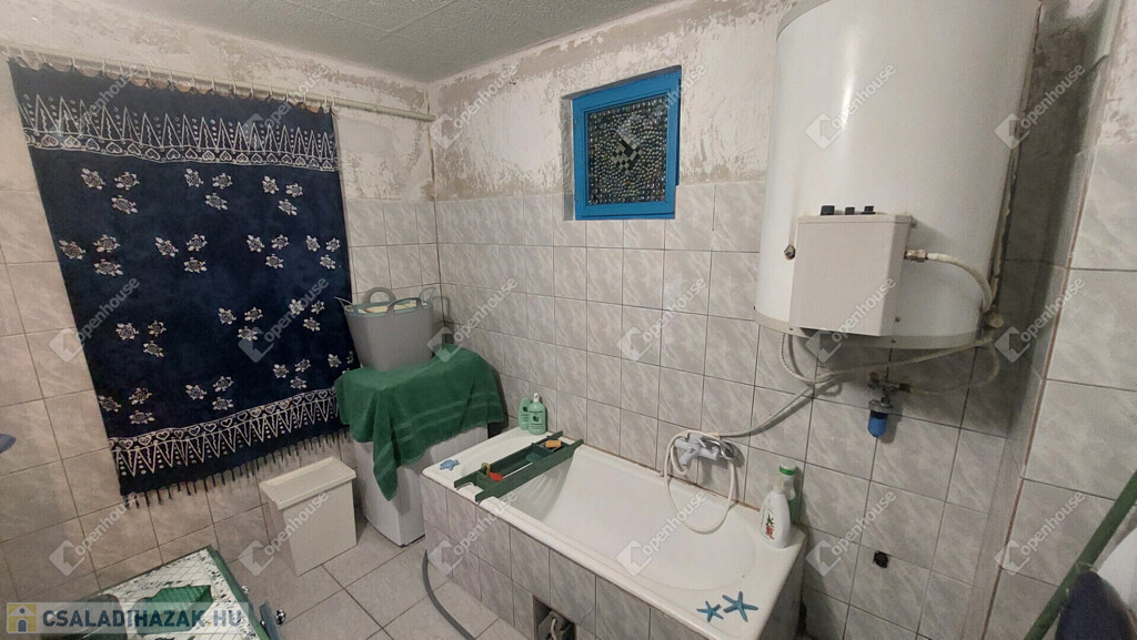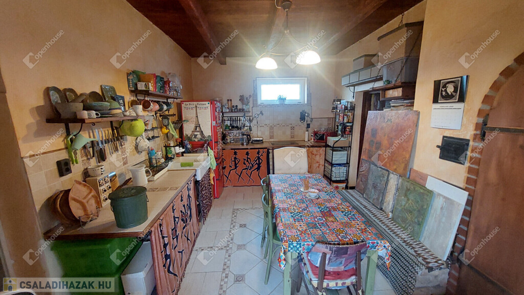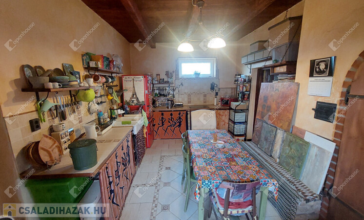 A konyha egyedi hangulatát a téglából épített, rusztikus jellegű konyhabútor-alap adja. A beépített sütő és főzőlap a vételár részét képezi, valamint a stílusban hozzá illő csaptelep és mosogató is beépítésre került. A melegvizet gázbojler biztosítja. A fürdőszoba nagyméretű káddal felszerelt.