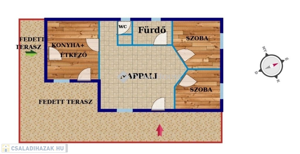 Alapterület 63 m2, fedett terasz 25 m2, telek területe 981 m2