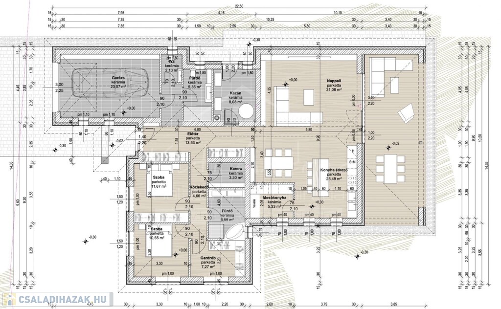 • A lakóház mérete nettó 159 m2 garázzsal együtt.