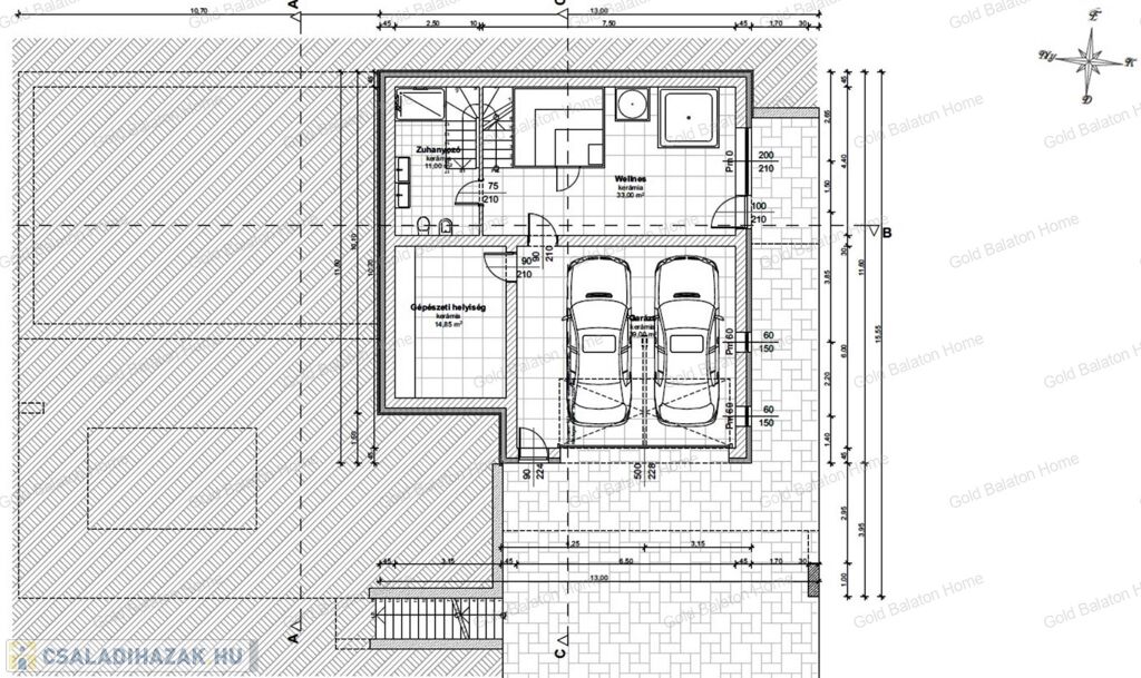 - utca szint: duplagarázs, gépészeti helyiség, Wellness részleg, fürdőszoba