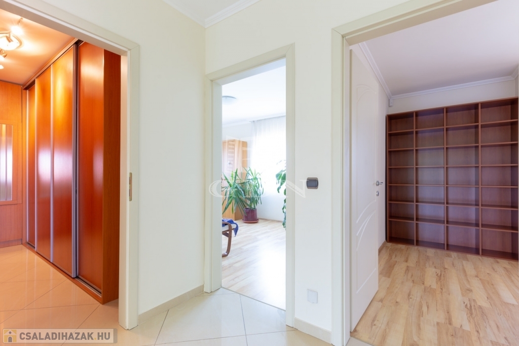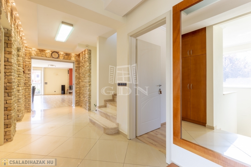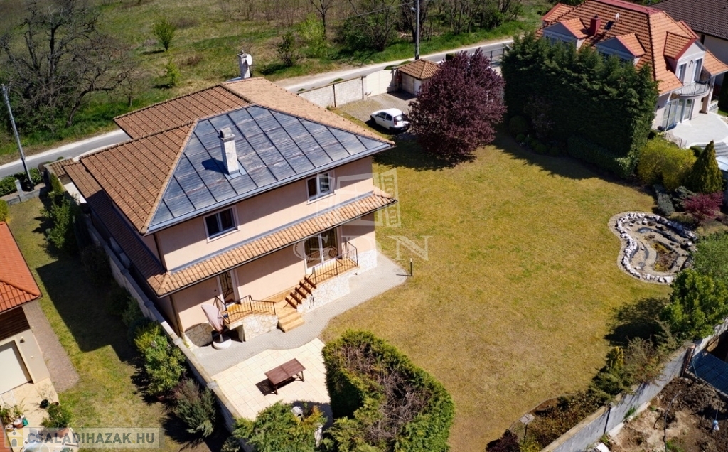 A ház dupla telekre épült 1309 nm-es így a 3 szintes 364 nm-es 5+1 félszobás 2 gardrób szobás ingatlan mellett bőven maradt hely a gondozott parkosított kertnek.
