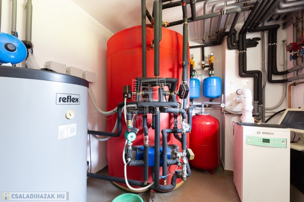 A családi háznak egyedi fűtését és melegvíz ellátását számítógép irányítja, és padlófűtéssel biztosítja a kiemelkedő komfortérzetet. Minden helyiség klimatizált.
