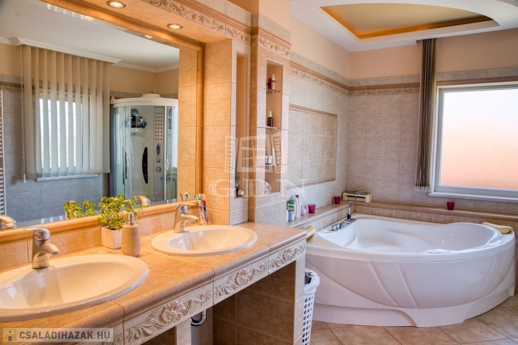 - tágas fürdőszoba (zuhanyzós gőzkabinnal, fényterápiás hidromasszázs két személyes káddal, dupla mosdóval, bidével),