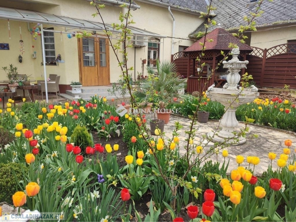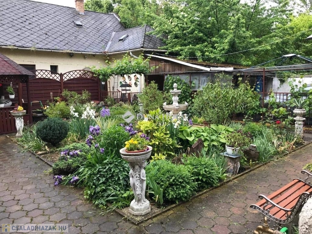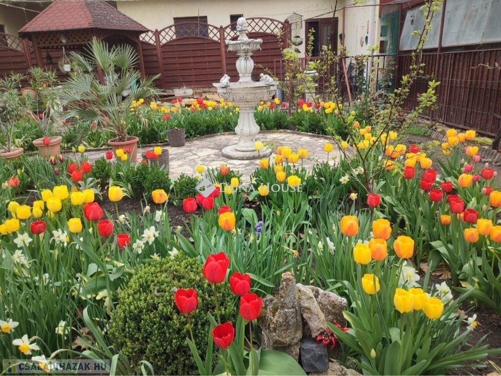 Gondozott kert szökőkúttal, külön vízórás kerti csappal és kerti pavilonnal