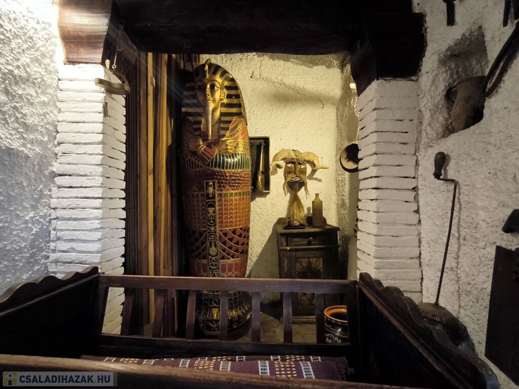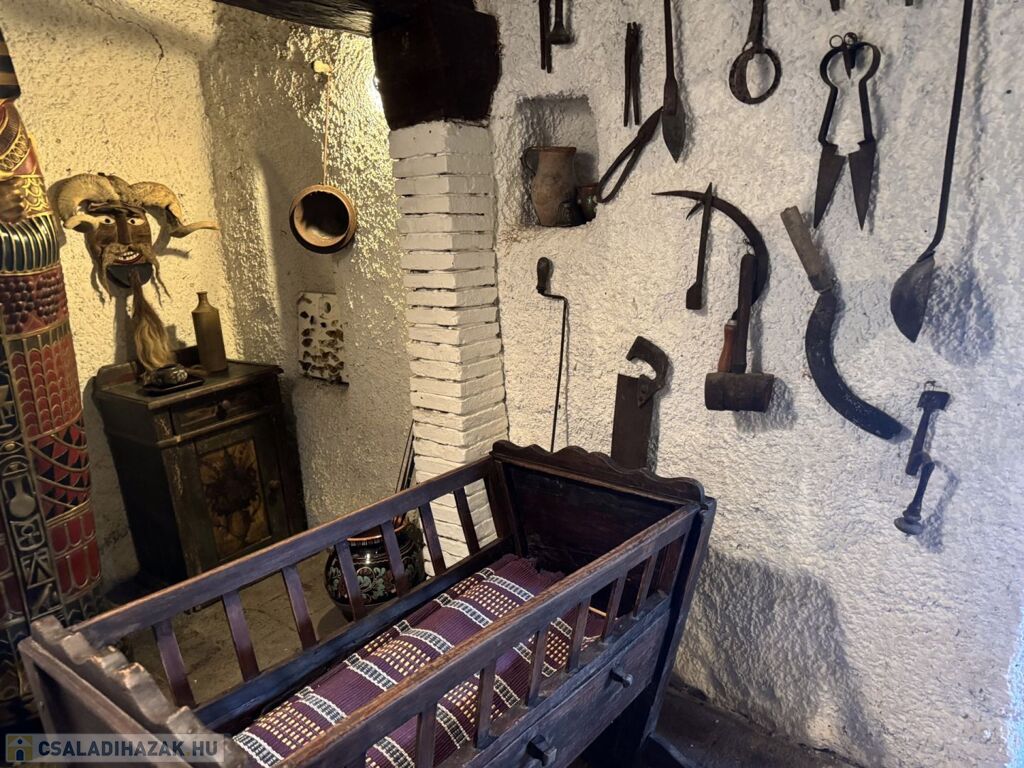 Az épület egy része földben lévő, földdel borított, vastag kő falakból álló pince. Ebben a részben található az étkező- konyha fa tüzeléses búbos kemence, egy kádas fürdőszoba és egy tároló.