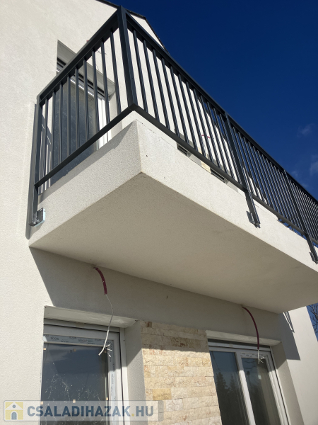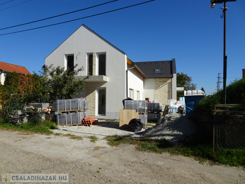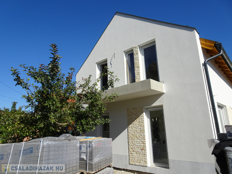 Az ikerház utcafronthoz közelebbi fele már elkelt, az eladásra kínált lakás kellő mértékben elkülönül a másik lakástól és az utcától.
