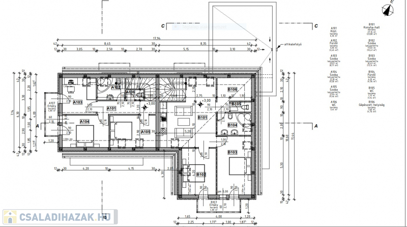 Az emeleten fürdő és külön WC, egy nappali valamint 2 hálószoba és egy erkély kerül kialakításra. A tetőtérben 58,22 m2 az 1,9 m feletti belmagasságú terület.
