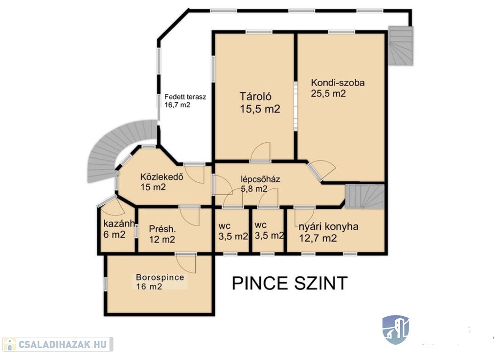 -pince szintjén, borospince, vizes blokk , konyha,  két nagyobb helyiség is található amely több célra is alkalmas. (kondiszoba, műhely, játszó szoba..stb) - lakássá alakítható!