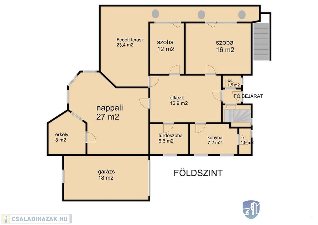 - földszintjén külön bejárattal: konyha-étkező mellett nappali, és 2 szoba, valamint fürdőszoba, kamra, egy nagyméretű erkély, valamit garázs kapott helyet.