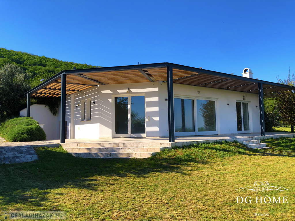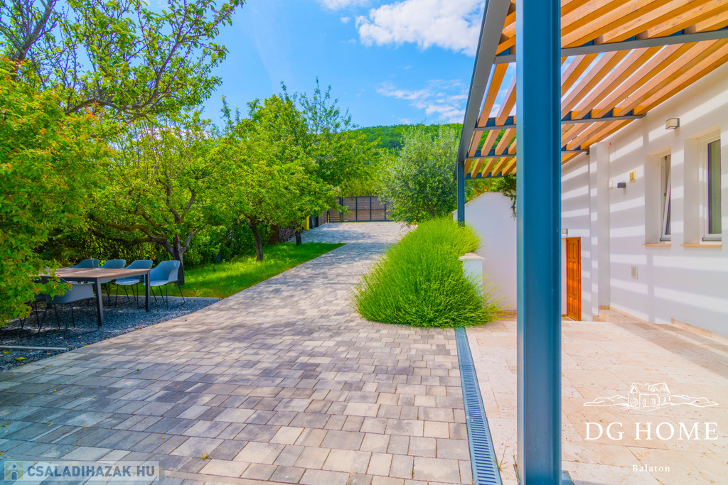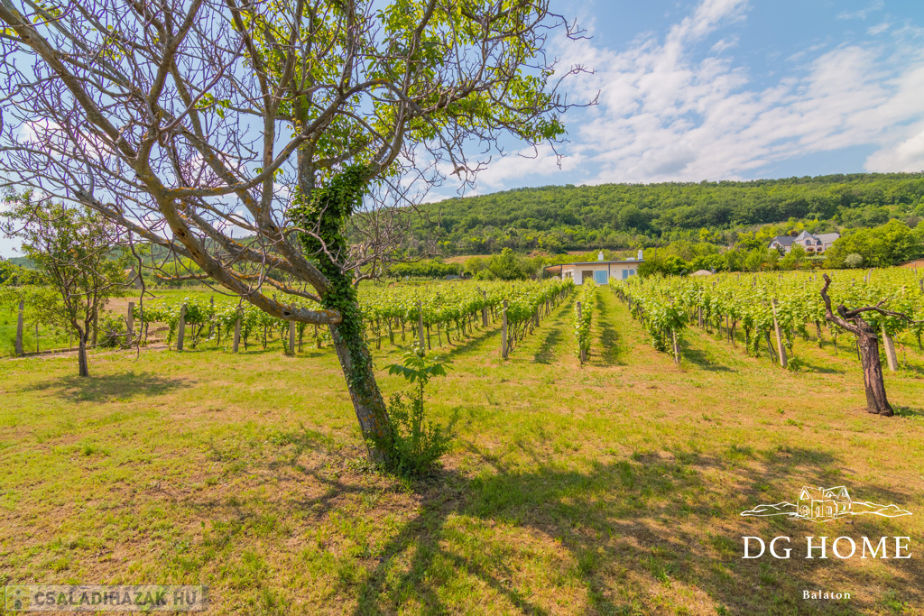 Eladó Csopakon egy 2018-ban épült, 165 m²-es, elegáns újszerű családi ház, páratlan balatoni panorámával, amely minden évszakban lenyűgöző látványt nyújt. Az ingatlan egy 3096 m²-es telken helyezkedik el, melyet gondosan művelt, minősített olaszrizling szőlő ölel körül.