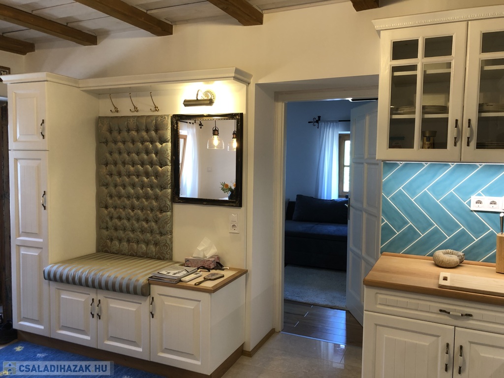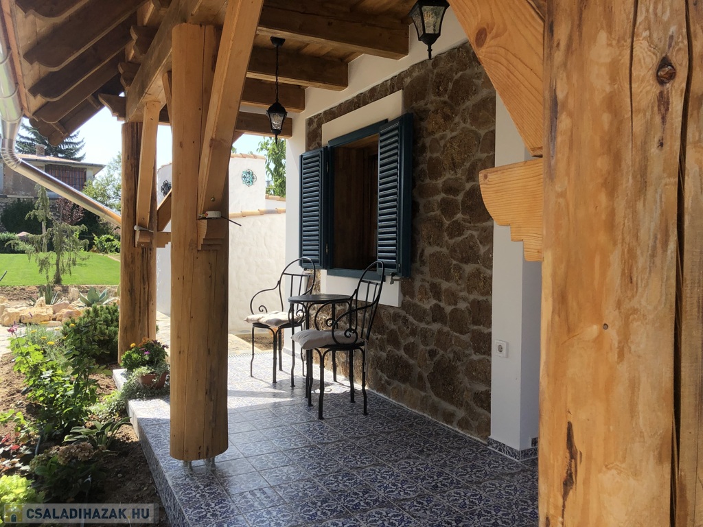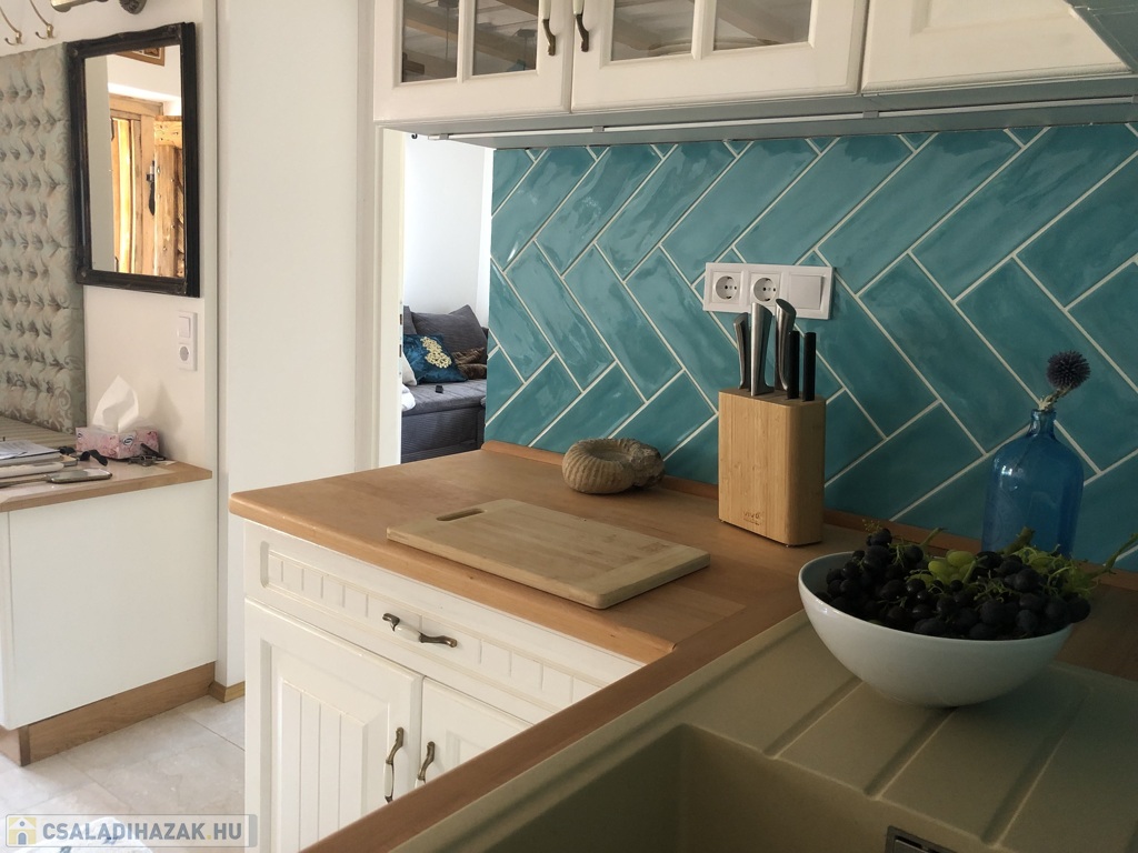 A ház központi tere a napfényben úszó fa körterasz, melyhez kényelmes nappali és egy fürdőszoba kapcsolódik. A konyhában a tömörfa konyhabútor AEG gépekkel és kézzel készített kerámia burkolatokkal egészül ki, ami valódi mestermunka.