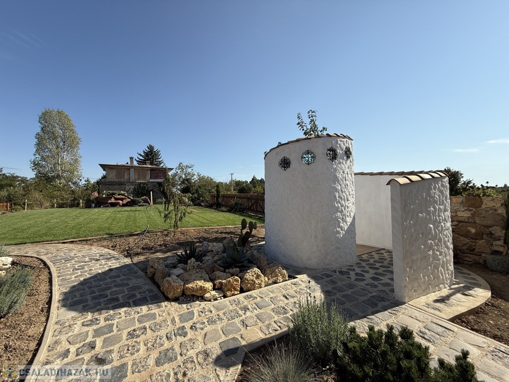 A főépülettől jobbra egy Ytong falazatú, tihanyi kővel burkolt melléképület (25 m2) helyezkedik el, szintén hódfarkú cserépfedéssel, valamint egy olasz mediterrán cserépfedéssel burkolt kerti zuhanyzó, Midea fűtőszálas vízmelegítővel. A tereket 300 m2-en travertin mészkő lépcső és bazalt macskaköves út köti össze.