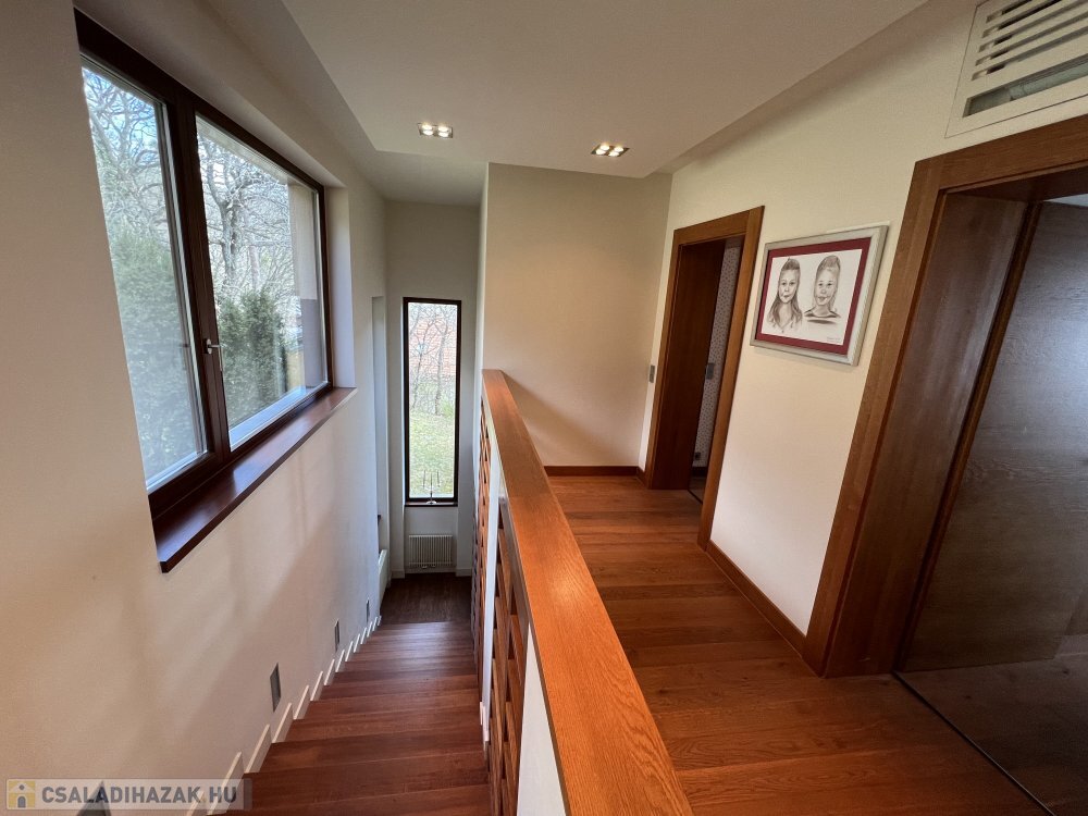 A széles belső lépcső elegáns minőségi fa burkolatot kapott.