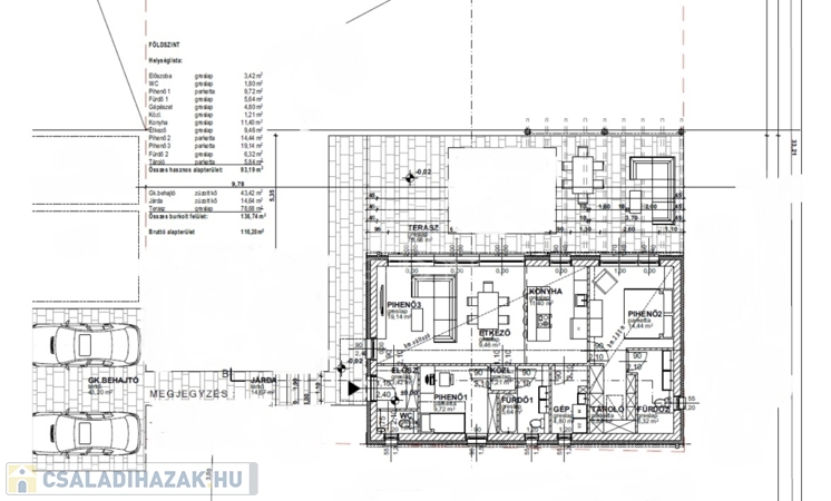 A 2025-ben épült ingatlan 93 négyzetméter hasznos alapterülettel rendelkezik, mely ideális elrendezést biztosít: egy körbe napozott amerikai konyha-nappali mellett két tágas hálószoba, két különálló fürdőszoba, előszoba és háztartási helyiség került kialakításra. A belső tér rugalmasan alakítható, így igény szerint akár nappali + 3 szobás elrendezés is megvalósítható. Az életteret jelentősen kiterjeszti a házhoz kapcsolódó 79 négyzetméteres terasz.