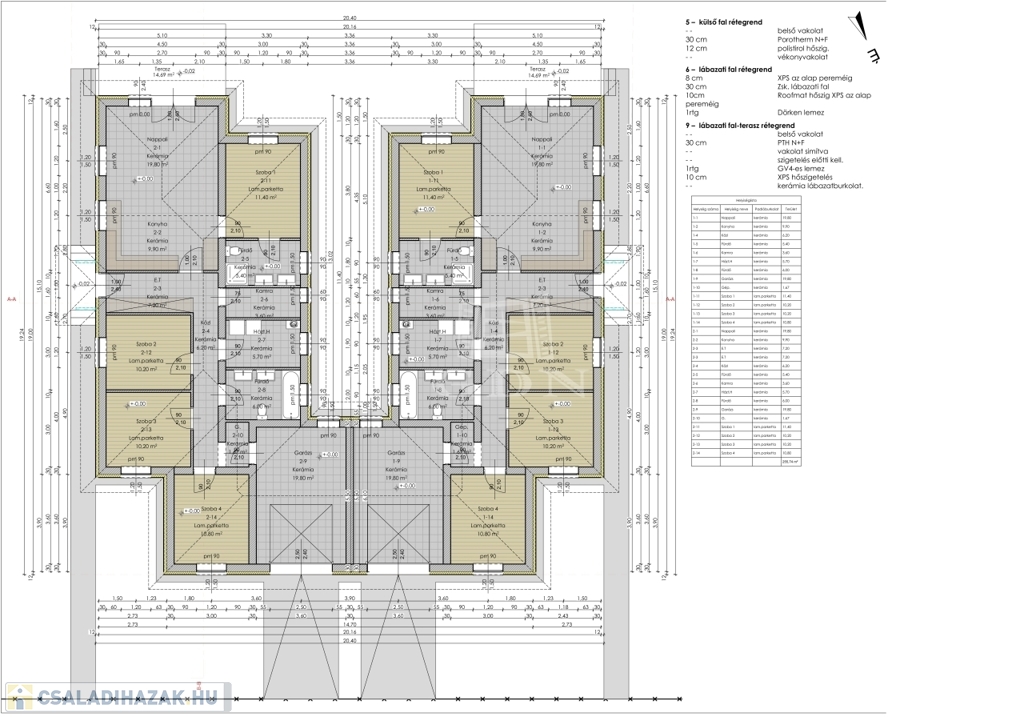 Mindkét házrész nettó 128 m²-es, azonos méretű 541 m²-es kizárólagos használatú telekrészekkel, 4 külön hálószobával, amerikai konyhás nappalival, illetve két fürdőszobával és egy 19,8 m²-es garázzsal.