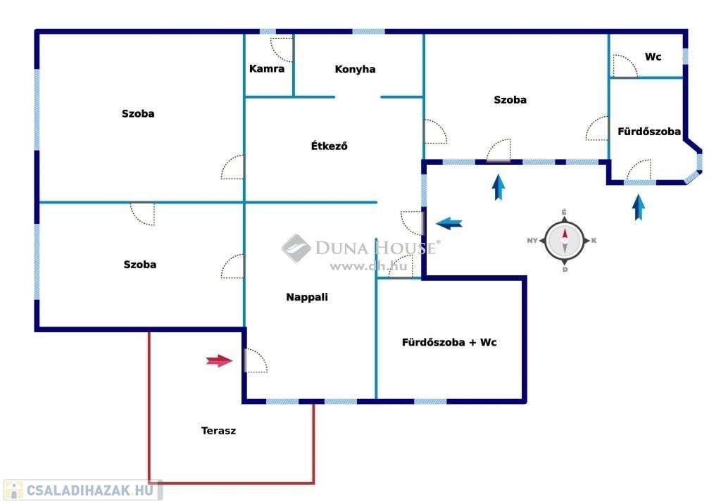 Az ingatlan remek elrendezésű, egy nappaliszoba, 3 hálószoba, egy étkező, egy ablakos konyha, két fürdőszoba és hozzájuk csatlakozó wc, továbbá egy kamra helyiségek kaptak benne helyet. Elrendezése kedvező, könnyen átalakítható két generációssá, vagy akár két külön lakássá is, így önálósuló gyermekkel, vagy idős szülőkkel költözők számára is ideális választás lehet.