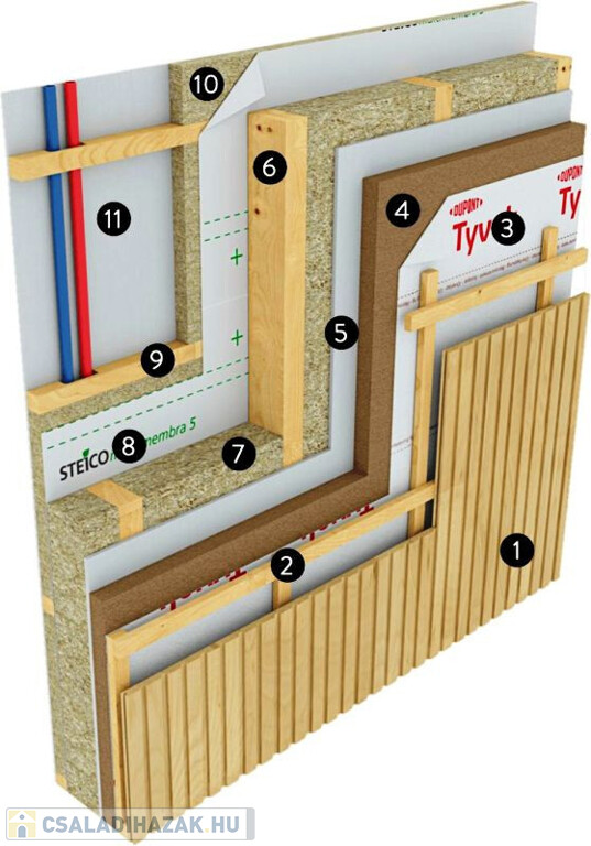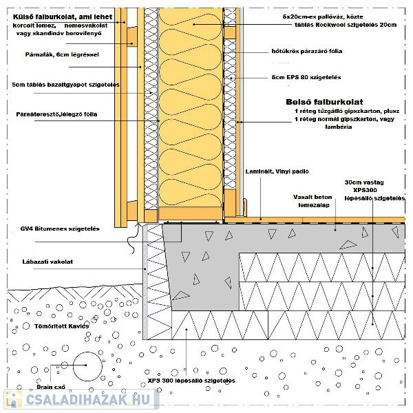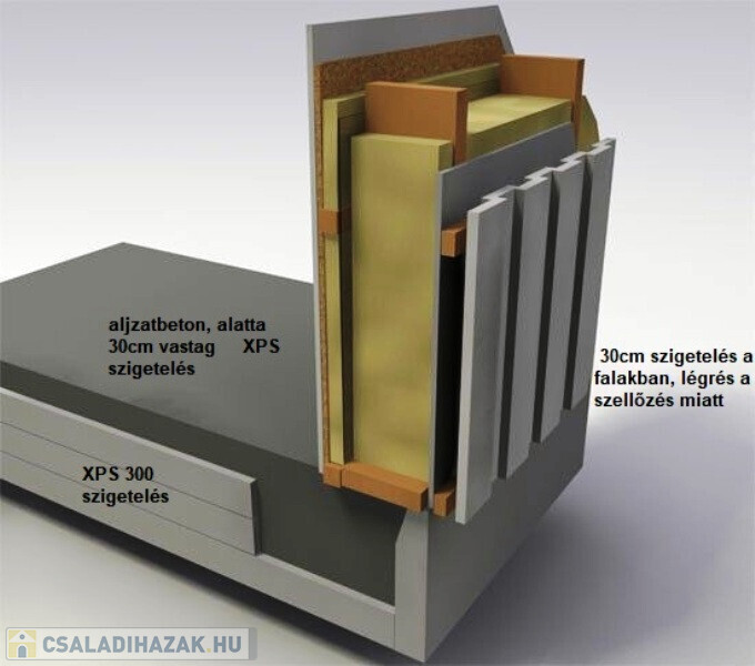 Passzív ház az, amelynek fűtési igénye egytizede a normál lakóházaknak. Kiváló hőszigetelés: A+++, ami azt jelenti, hogy az alapban 30 cm vastag XPS 300 az aljzatbeton alatt, a 20 cm vázszerkezetben kívül és belül is 2X5 cm táblás bazaltgyapot szigetelés, illetve minimum 5 cm kiszellőztetett légrés a főfalakban és a tetőszerkezeben is.