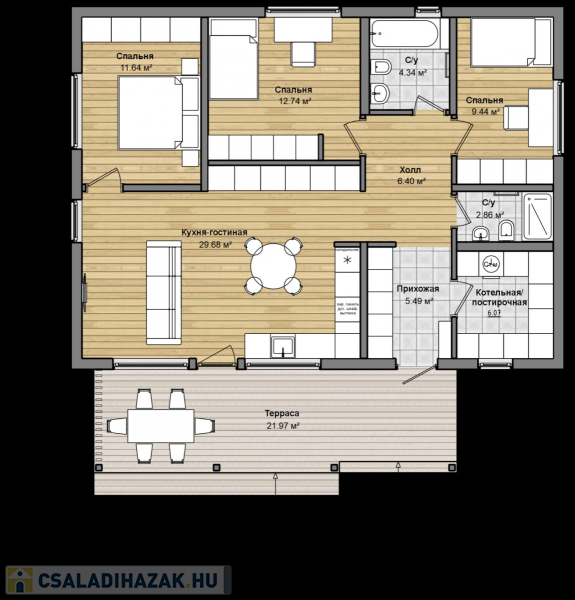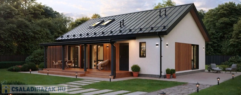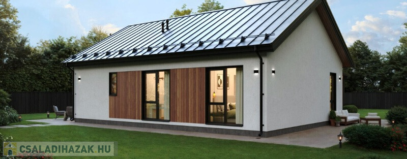 A ház belső elosztása:  3 hálószoba, amerikai konyhás nappali, 2  fürdőszoba, tároló + 21 cm terasz.