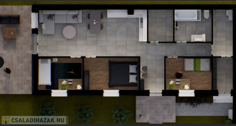 Kialakítása: 2 szoba, nappali, konyha+étkező, fürdő+wc, külön wc, előtér, közlekedő, háztartási helyiség, kamra, nyitott terasz 20 m2