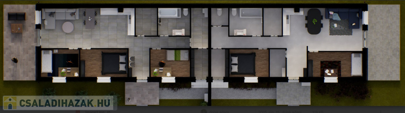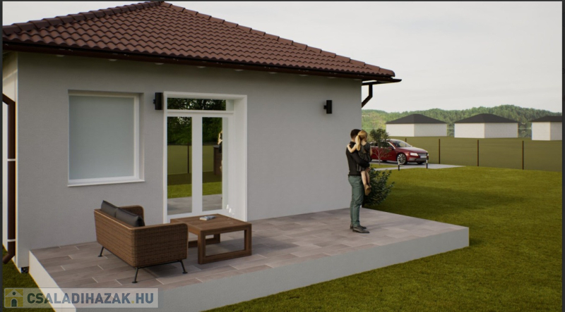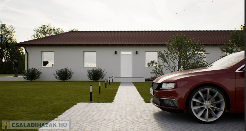 Kialakítása: 2 szoba, nappali, konyha+étkező, fürdő+wc, külön wc, előtér, közlekedő, háztartási helyiség, kamra, nyitott terasz 20 m2