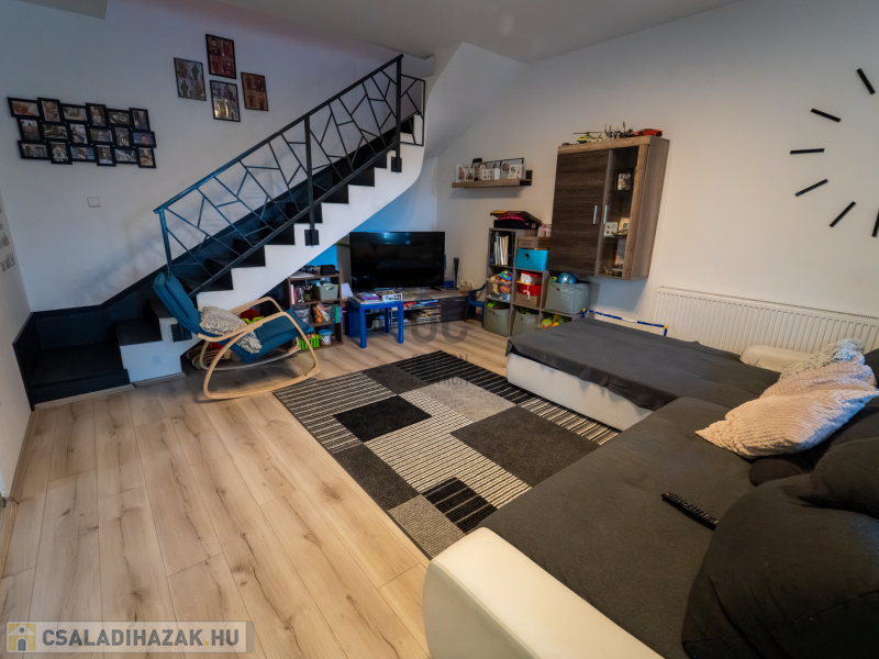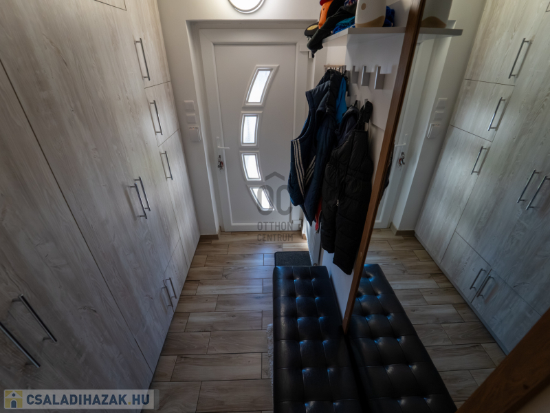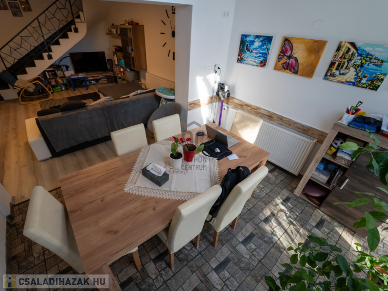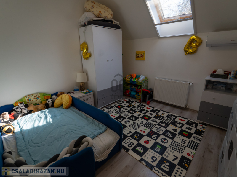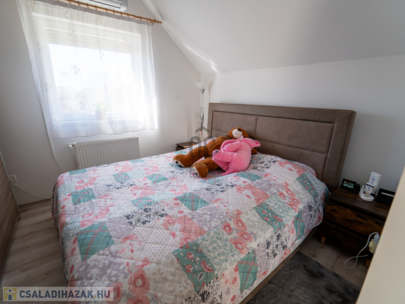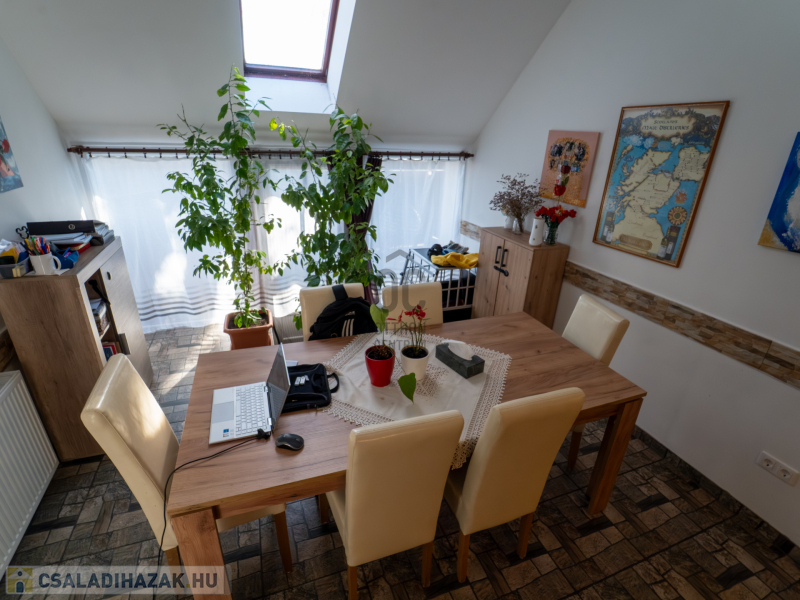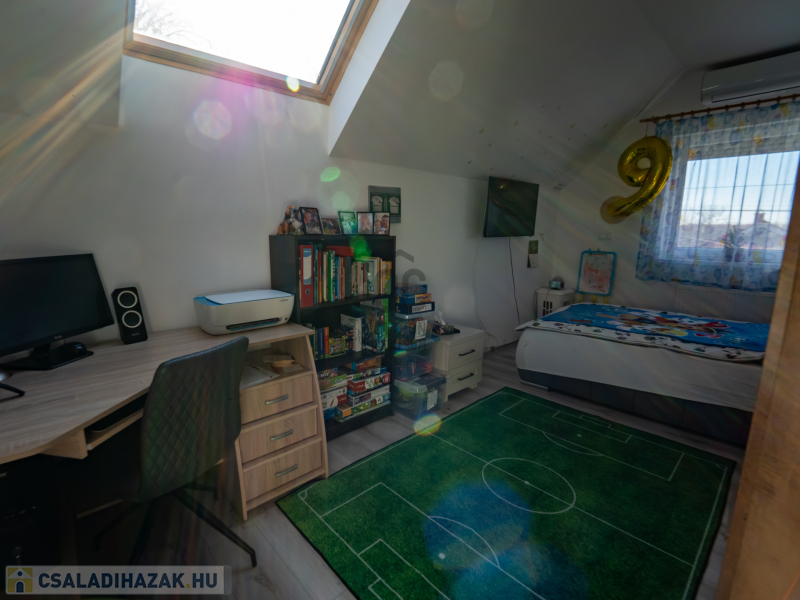 A 2005-ben épült, tégla falazatú, tetőteres családi ház tágas és jól átgondolt elrendezésű. A földszinten világos nappali–étkező–konyha tér fogad, külön fürdővel és WC-vel. Az emeleten három külön nyíló szoba és egy zuhanyzós fürdőszoba biztosít kényelmes életteret akár családnak, akár otthoni munkavégzéshez.