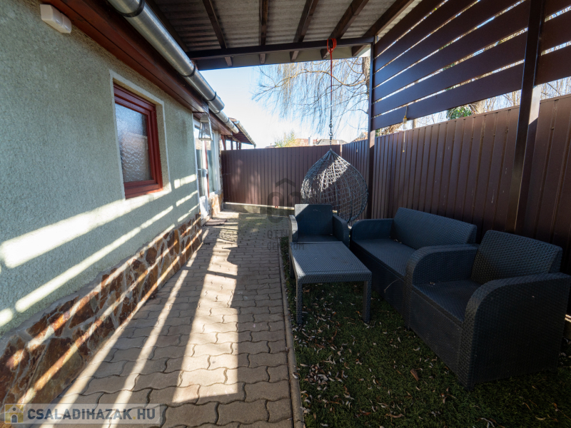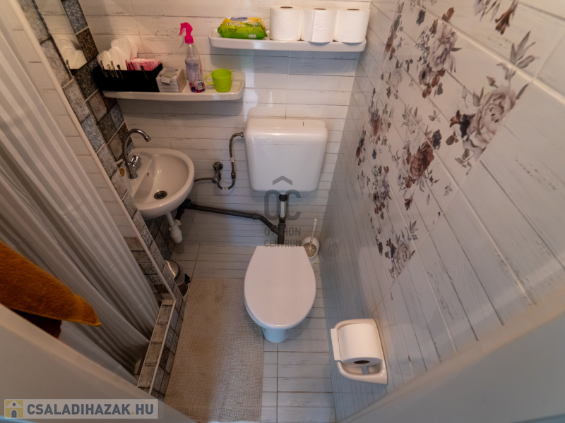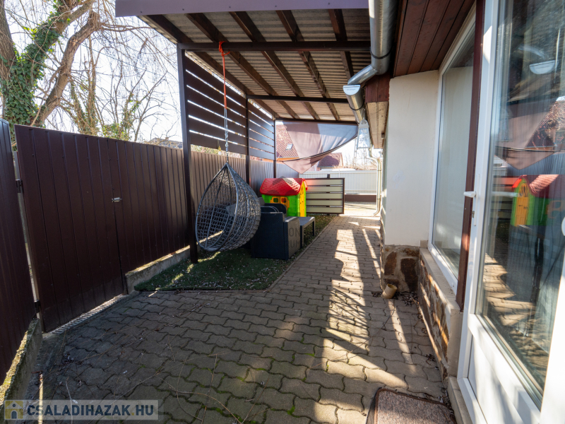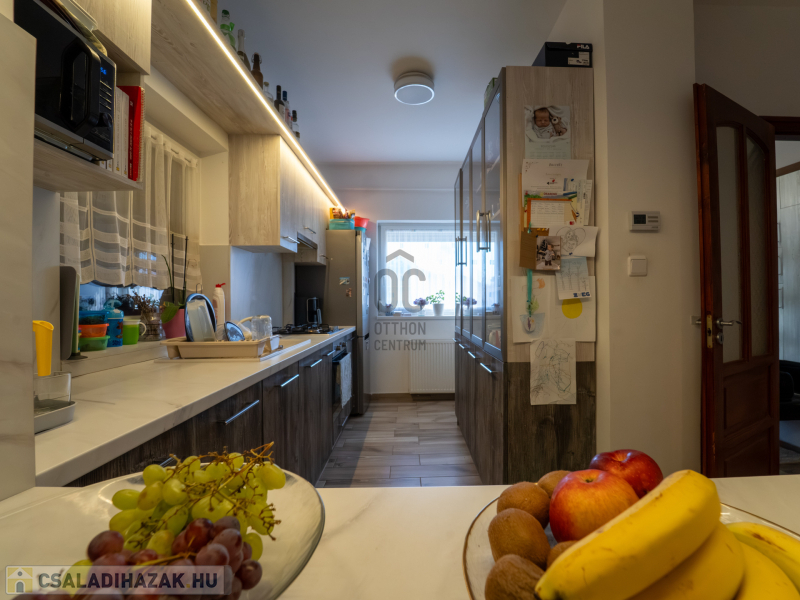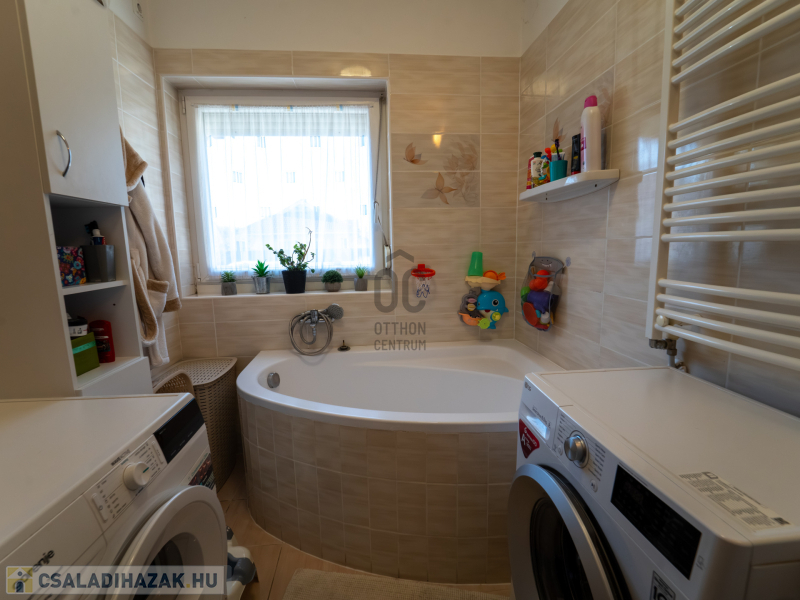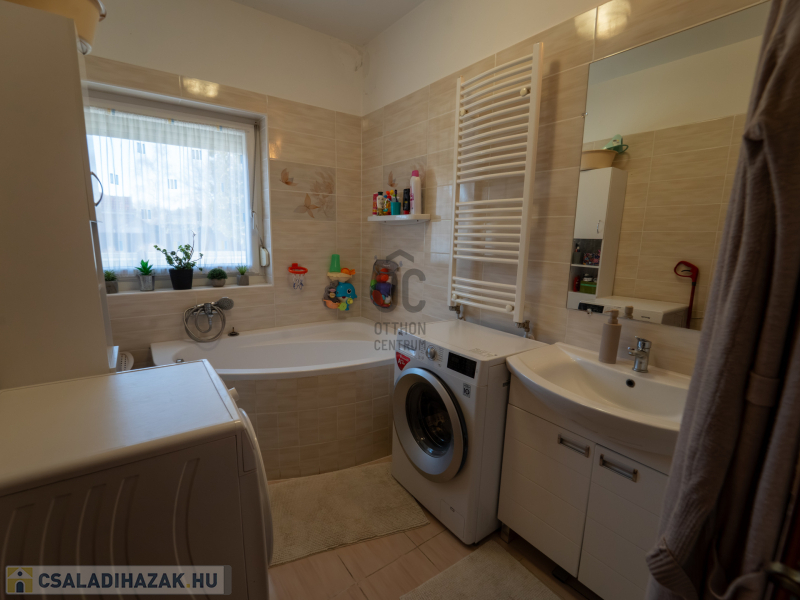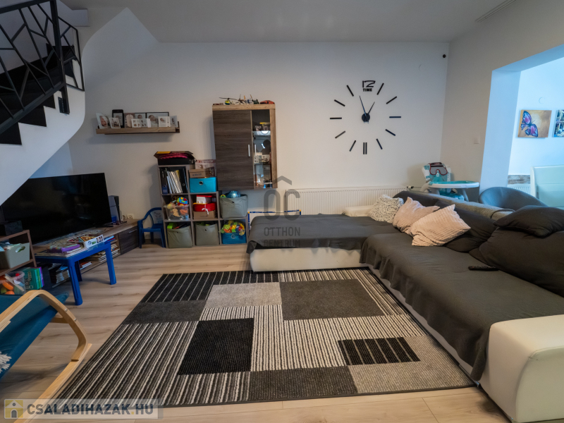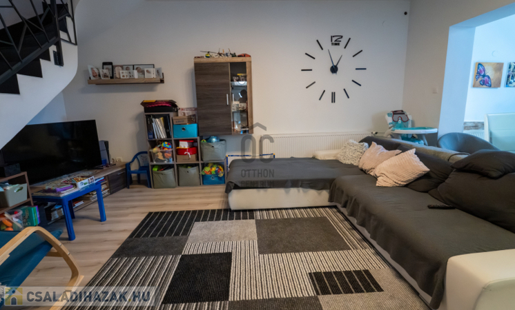 A 2005-ben épült, tégla falazatú, tetőteres családi ház tágas és jól átgondolt elrendezésű. A földszinten világos nappali–étkező–konyha tér fogad, külön fürdővel és WC-vel. Az emeleten három külön nyíló szoba és egy zuhanyzós fürdőszoba biztosít kényelmes életteret akár családnak, akár otthoni munkavégzéshez.