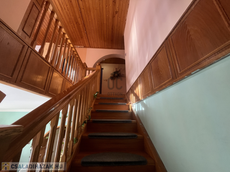 A 140 m²-es, 2 szintes főépület 4 hálószobával, 2 nappalival, 2 fürdőszobával és 2 külön WC-vel kínál kényelmes életteret akár nagycsaládosoknak, akár többgenerációs együttéléshez. Az emeletre vezető gyönyörű, faragott fa lépcső, a tágas terek és a világos szobák mind a minőségi életérzést erősítik.