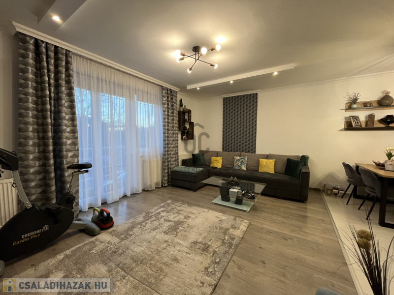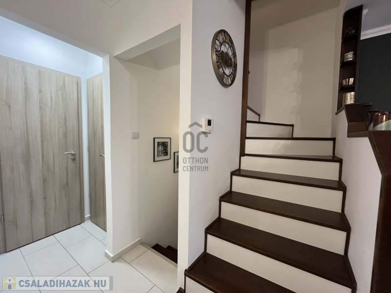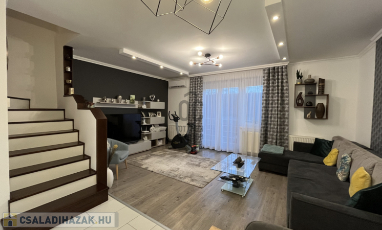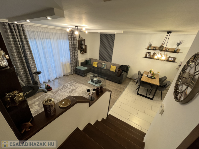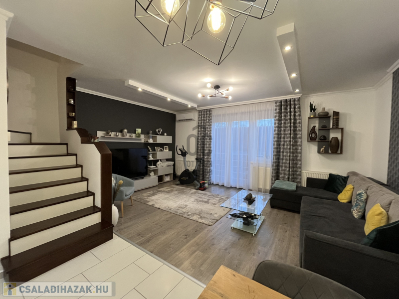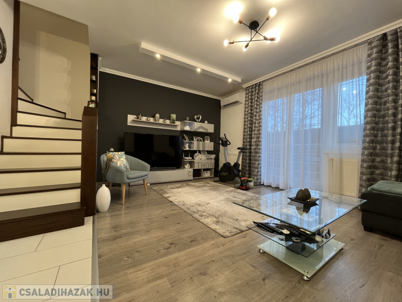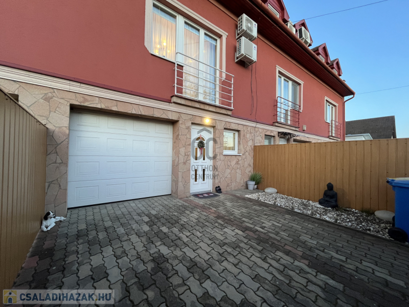 Az ingatlan 2007-ben épült, 108 m2-es térkövezett elő és hátsó kerttel, garázzsal, valamint külön bejáratú alsó szinttel rendelkezik, amely irodának, rendelőnek vagy üzleti célra is ideális lehet.