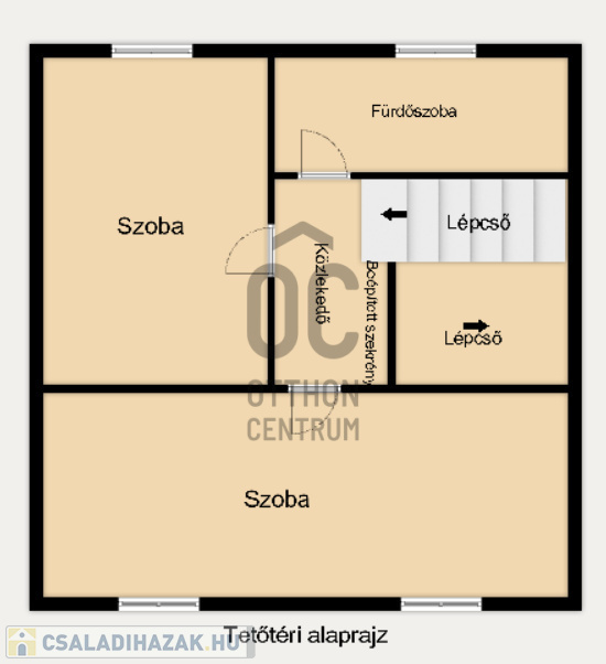 A tetőtérben eredetileg 3 kisebb szoba volt tervezve, viszont a tulajdonosok kettőt egybe nyitottak, így itt kettő szoba található.