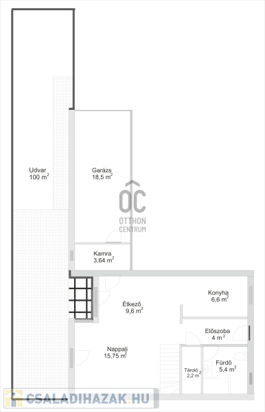 Földszint: amerikai konyhás nappali, étkező, spájz, zuhanyzós fürdő wc-vel, 18 m²-es elektromos kapus garázs.