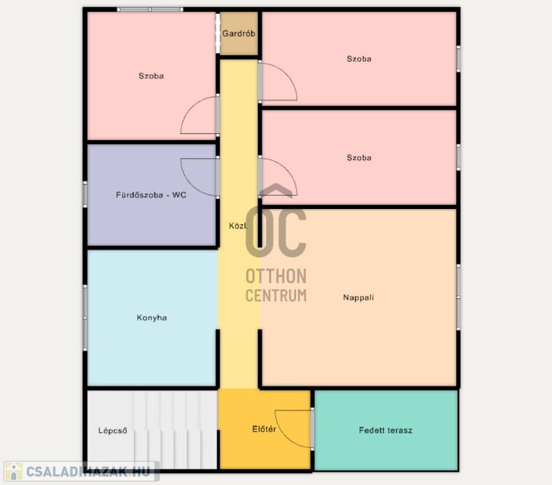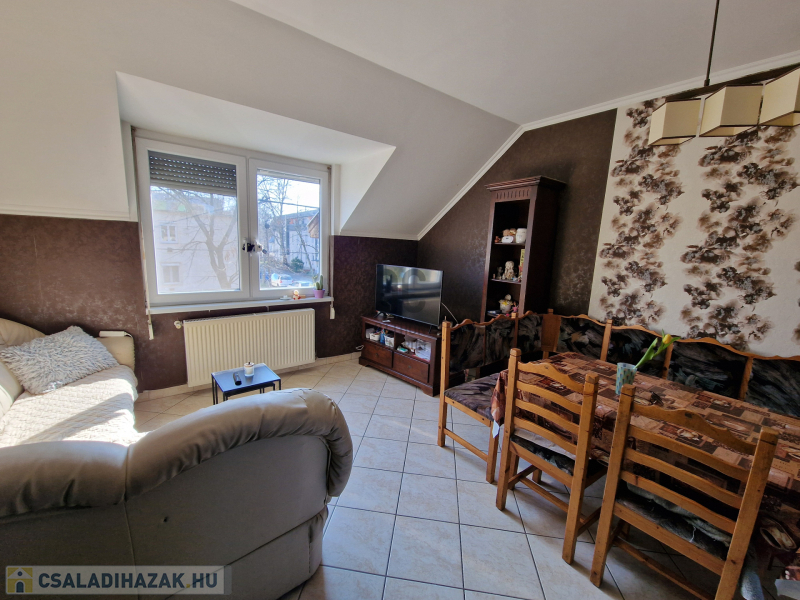 Emelet helyiségei: Nappali, konyha, étkező, 3 hálószoba, fürdő szoba-wc-vel egy helyiségben, 5 nm-es loggia. Fiatalos, modernizált belső terek.
