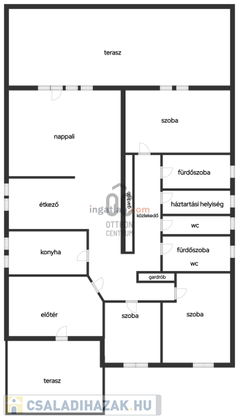 A kapu elektromos vezetékelése megtörtént, csak a mozgató motorokat kell felszerelni igény szerint. A kerítés kovácsolt vasból készült, a horganyzásnak köszönhetően időtálló. A hatalmas, fedett hátsó terasz mellett a 13 m2-es első terasz is a kényelmet szolgálja.
