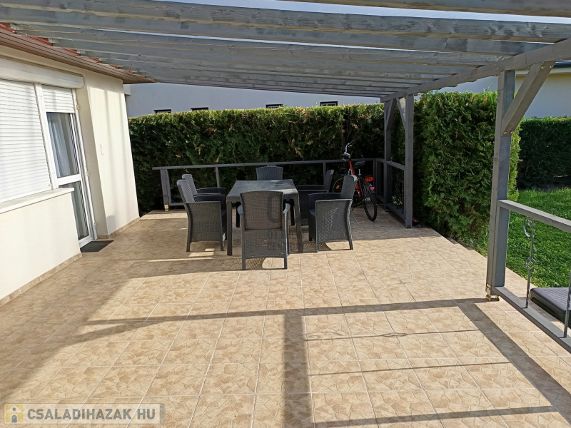 A nappaliból a 61 m2-es fedett teraszra jutunk, ahol nagyobb családi-baráti rendezvények is gond nélkül megrendezhetők. A kertben diófa, örökzöldek, kerti sütő segíti a relaxációt. A vízóra mellé öntözésre használt almérő került kiépítésre, ezért a csatornadíjat nem kell megfizetni ennek használata során. A parkosított kertben egy kerti tároló is helyet foglal, emellett egy fedett kocsibeálló is újonnan került létesítésre.
