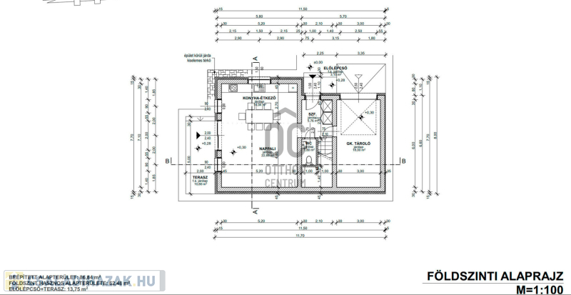 Fszt : konyha - étkező - nappali, wc , lépcső emeletre + garázs helyiségekből áll.