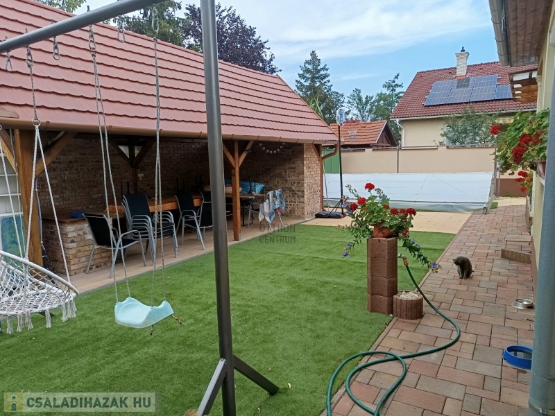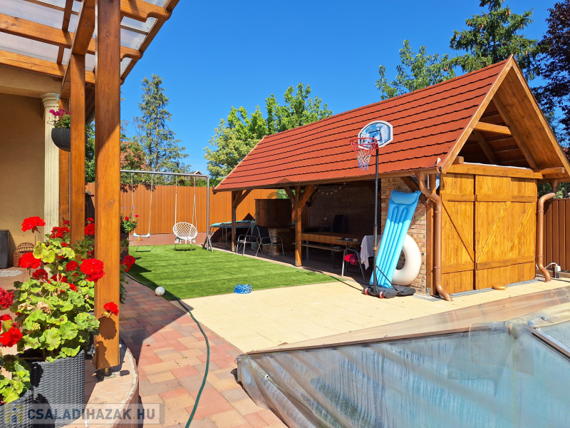 A 550 m²-es, gondosan parkosított telek igazi ékszerdoboz: a fedett teraszok, a beépített filagória, a bográcsozó és a kerti zuhanyzó tökéletes helyszínt kínálnak a családi és baráti összejövetelekhez, a saját gépészettel szerelt, fedhető 3x7 méteres medence pedig a nyári kikapcsolódás elengedhetetlen része. Az udvar műfűvel és térkővel borított, beépített tárolókkal praktikus megoldásokat nyújt, az automata öntözőrendszer pedig a virágok, évelő növények, vetemény és a termő barackfák gondozását könnyíti meg.