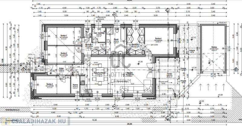 Az ingatlan nagyon jó elrendezésű, NAPPALI + 4 SZOBÁS, tehát : 4 db külön nyíló szobája van + a konyha - étkező - nappali, tágas fürdőszoba, 2 gardrob, garázs, + egy 25 m2 - es terasz.
