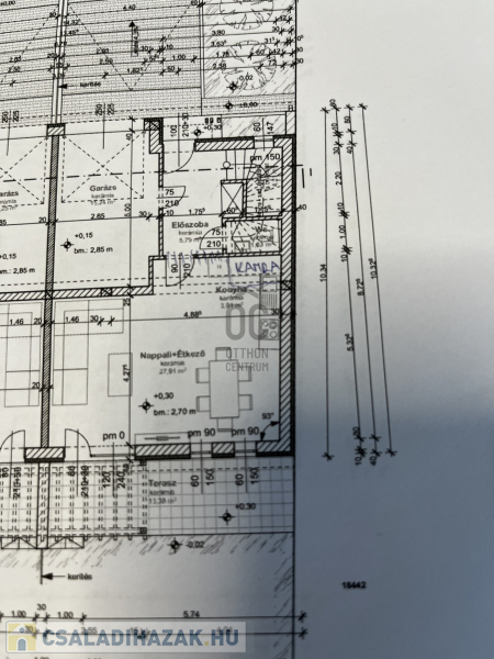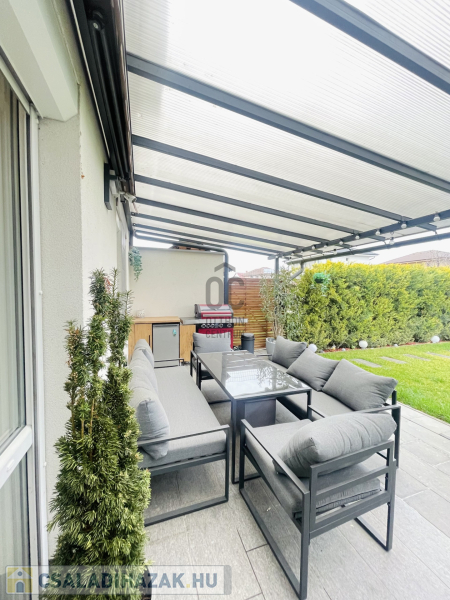 -nappali+ étkező + konyha egy légtérben, innen nyílik a 28 nm fedett terasz melyen kinti főzési lehetőség kialakítva, valamint a 80 nm kert.
