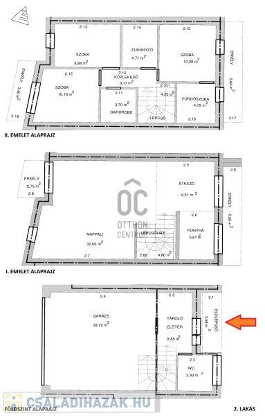 II. emeleti részen: szülői hálószoba gardróbbal és saját fürdőszobával, valamint 2 hálószoba külön fürdőszobával és erkély vagy teraszkapcsolattal