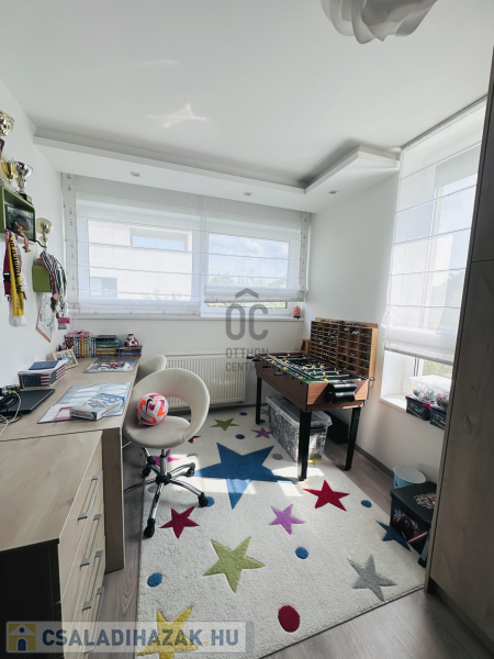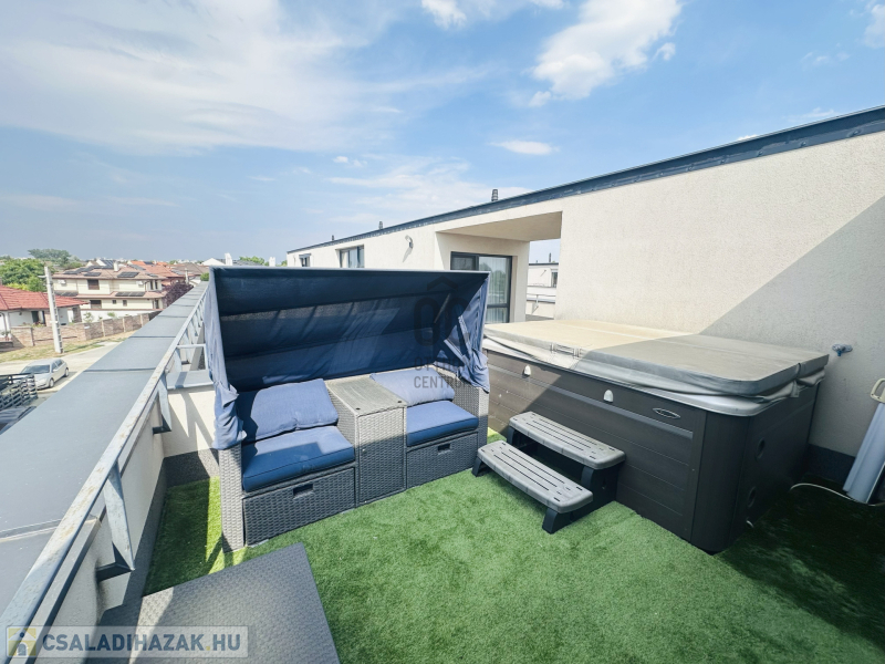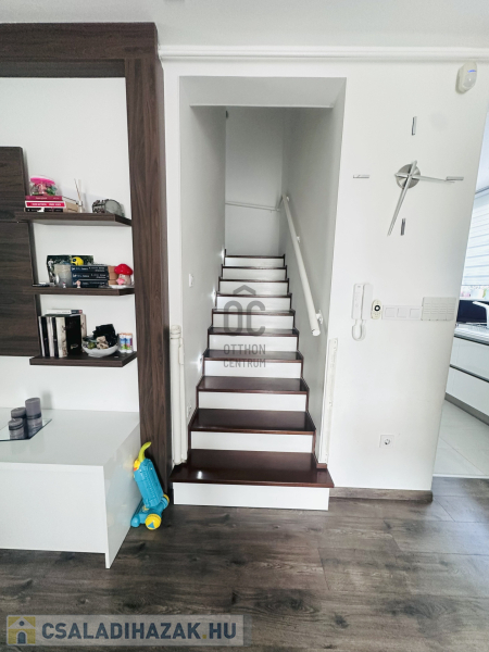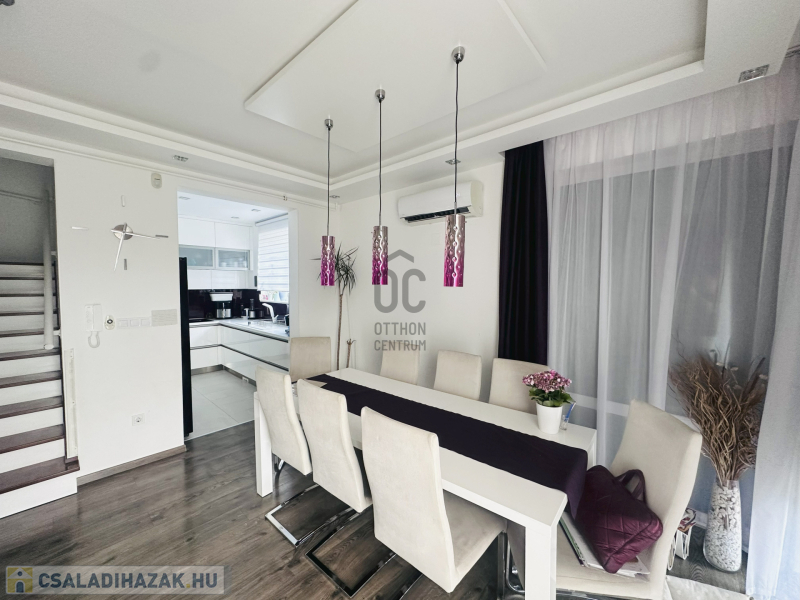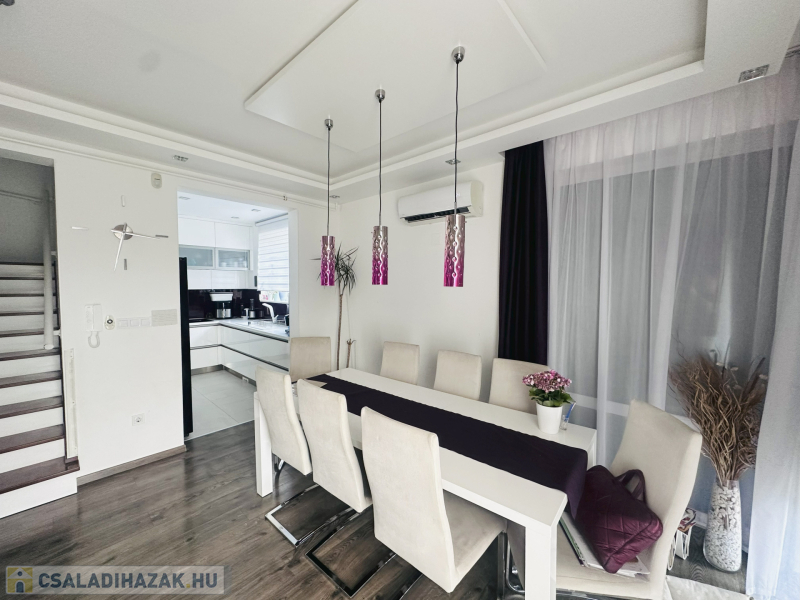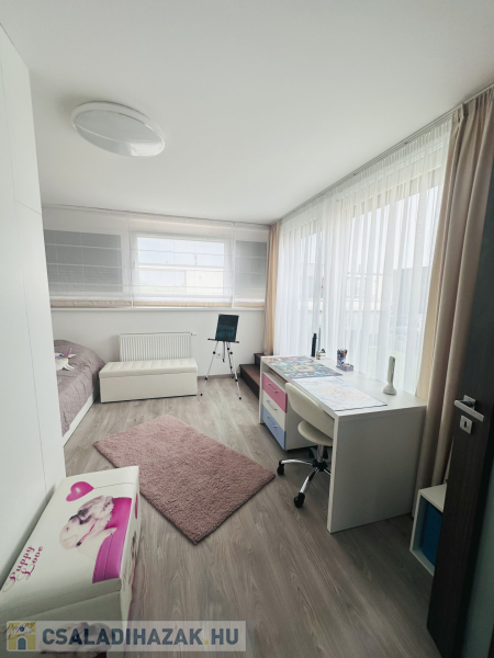 A 2018-ban épült, háromszintes, nappali + 5 szobás sorházi ingatlan közel 300 m² saját kerttel rendelkezik, amely a nappaliból és az utcáról is könnyedén megközelíthető.