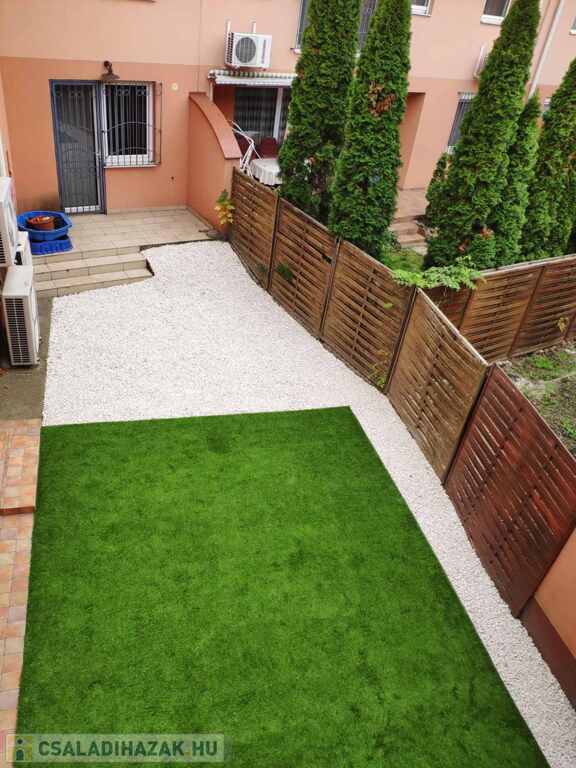A házhoz előkert és hátsó kert is tartozik, melyek kifejezetten alacsony fenntartási igényűek.