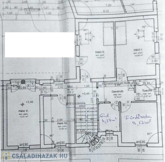• emeleten 3 db különnyíló, 14–15 m²-es hálószoba,