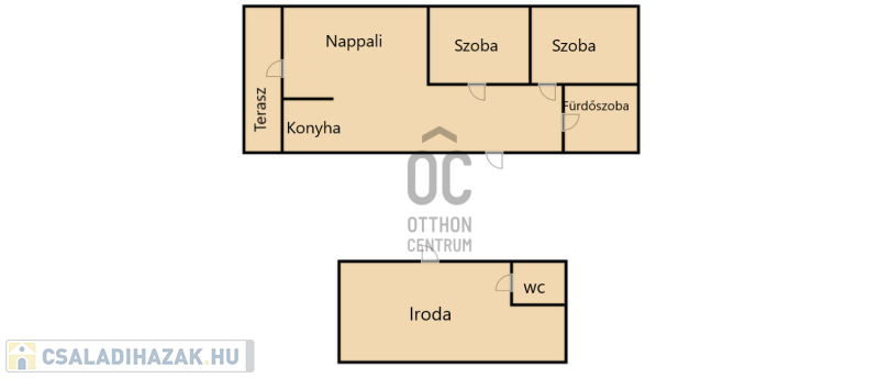 A ház nappali +2 szobával,konyhával és fürdőszobával rendelkezik. A nappaliból nyílik egy fedett terasz.