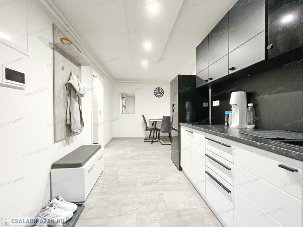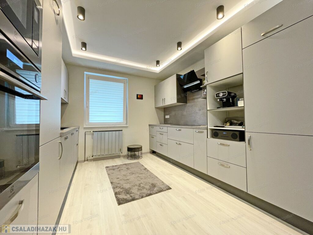 -első emelet: 92 m2, modern enteriőr, új és garanciás beépített bútorok, gépek, nappali-amerikai konyha, 2 hálószoba, fürdő-wc, erkély, teljes víz és elektromos rendszer cserélve,