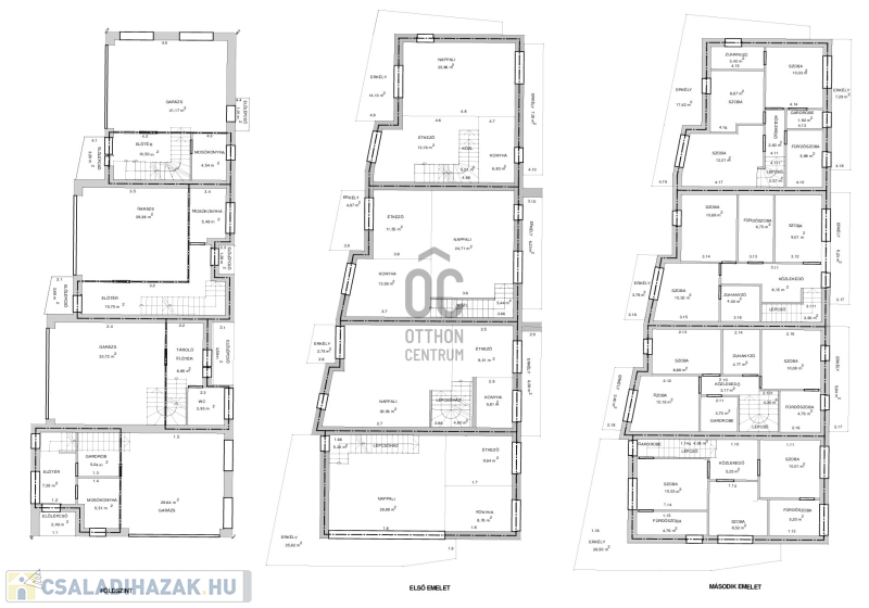 II. emeleti részen: szülői hálószoba gardróbbal és saját fürdőszobával, valamint 2 hálószoba külön fürdőszobával és erkély vagy teraszkapcsolattal