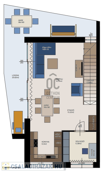 I. emeleten: nappali, étkező - konyha, erkély vagy teraszkapcsolattal