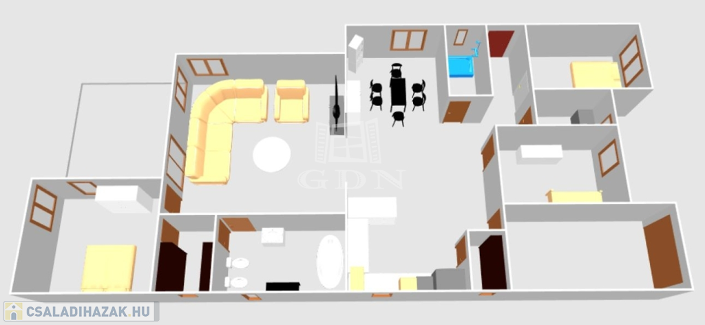 A családi ház hasznos alapterülete 183 nm, melyben található
