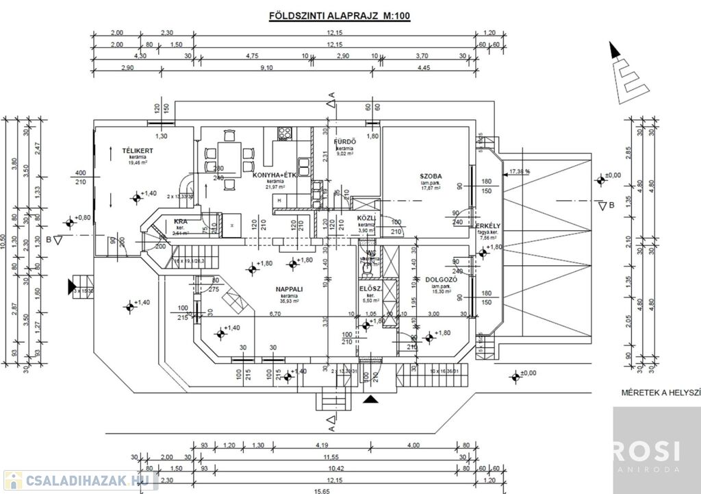 Földszint (136,5 m²) – világos nappali, étkező-konyha, 2 szoba, mosdó, kialakítandó fürdőszoba, és egy közel 20 m2-es télikert