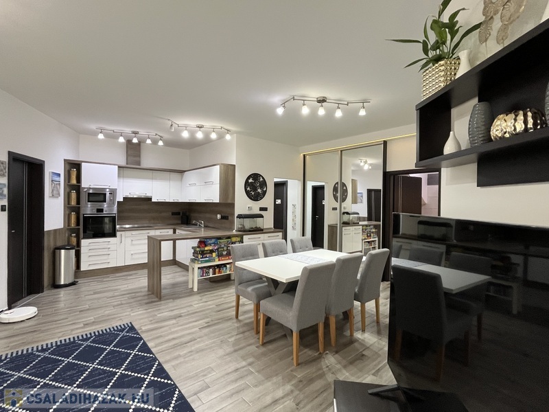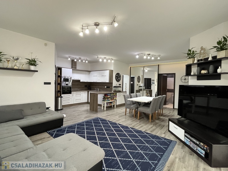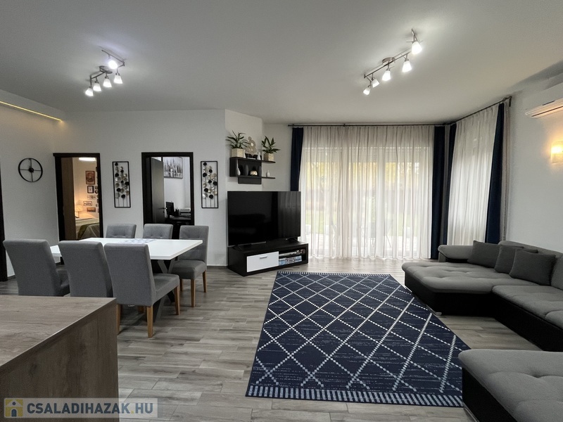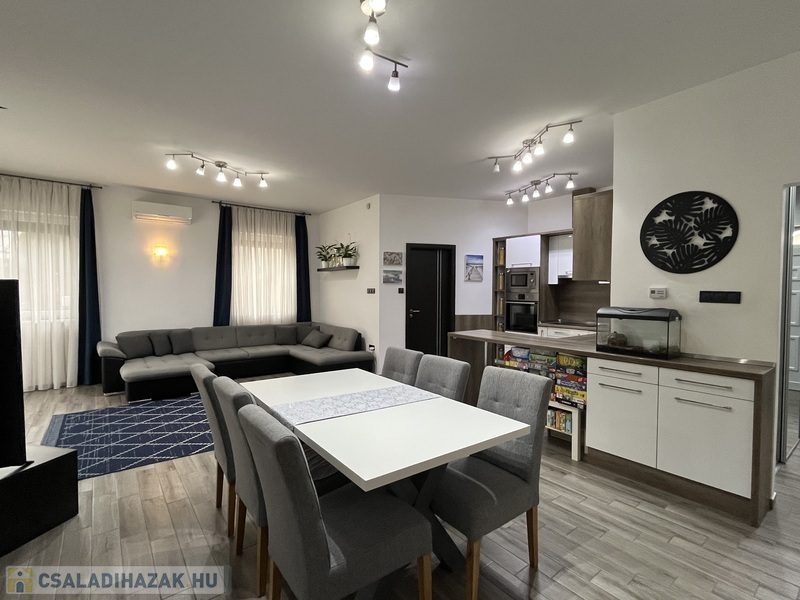 Eladó egy 141/120 m2-es, barátságos, tágas, világos 2+2 szobás sorház, hatalmas amerikai konyhás nappalival, 2 fürdõszobával, 2 WC-vel, nagy pihenõkerttel.