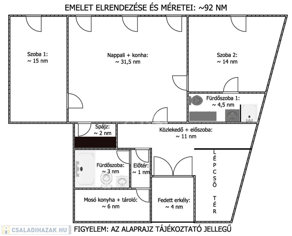 - Emeleten: előtér, mosókonyha, spájz, 2 fürdőszoba, mosdó, közlekedő, nappali-konyha-étkező, 2 szoba, lépcső tér.